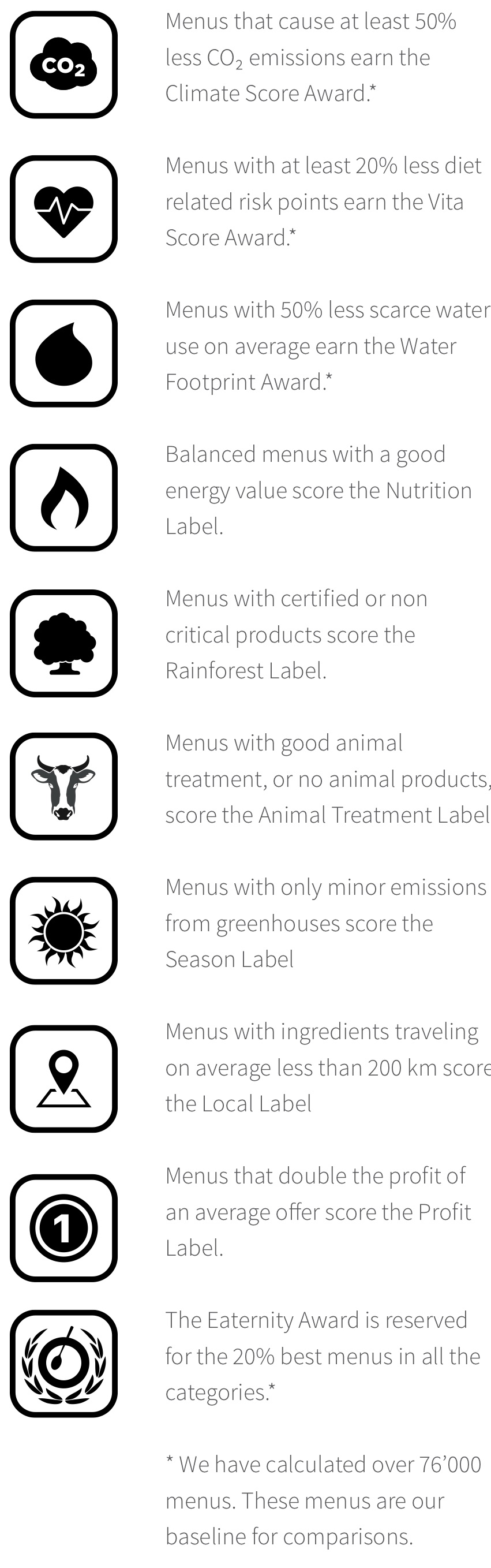 With eating-out on the rise in a modern society, the food service industry is facing a key-role, contributing to a sustainable agriculture and public health. Eaternity provides tools for smart chefs to measure, track and reduce the environmental impact of their restaurants and reduce disease risk along the way. At the push of a button, chefs can access our data and get the information they need to make smart choices. Large caterers and cafeteria operators have already signed on to Eaternity, taking on the challenge of reducing food-related CO₂ emissions and contributing to a healthier society. The best among these food service establishments are awarded the Eaternity Awards.