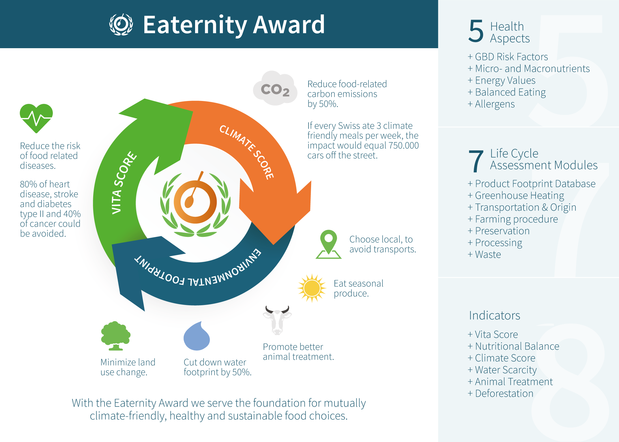 Eaternity has developed indicators for the carbon footprint, health, land-use change, good animal treatment, seasonality and the water footprint to help the food service industry make smart choices.